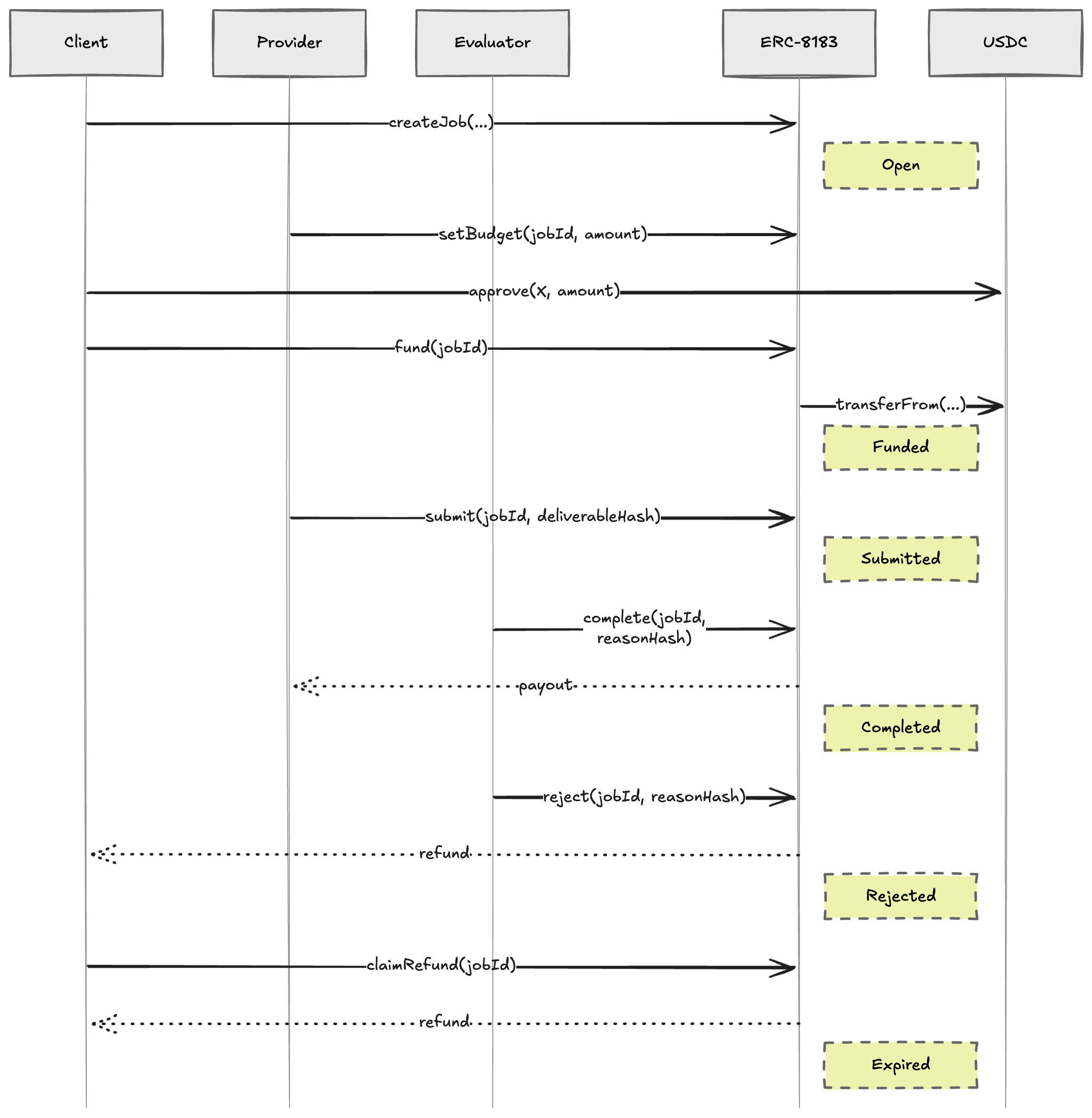 At a high level, an ERC-8183 job follows a structured flow between a client, provider, and evaluator, with escrow managed onchain.